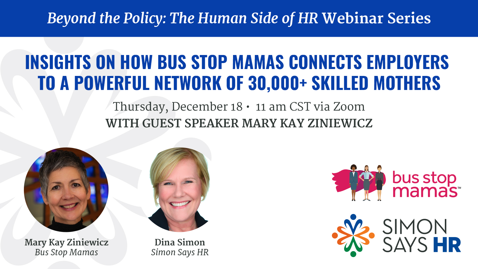 Join us for “Beyond the Policy: The Human Side of HR” webinar featuring Mary Kay Ziniewicz of Bus Stop Mamas